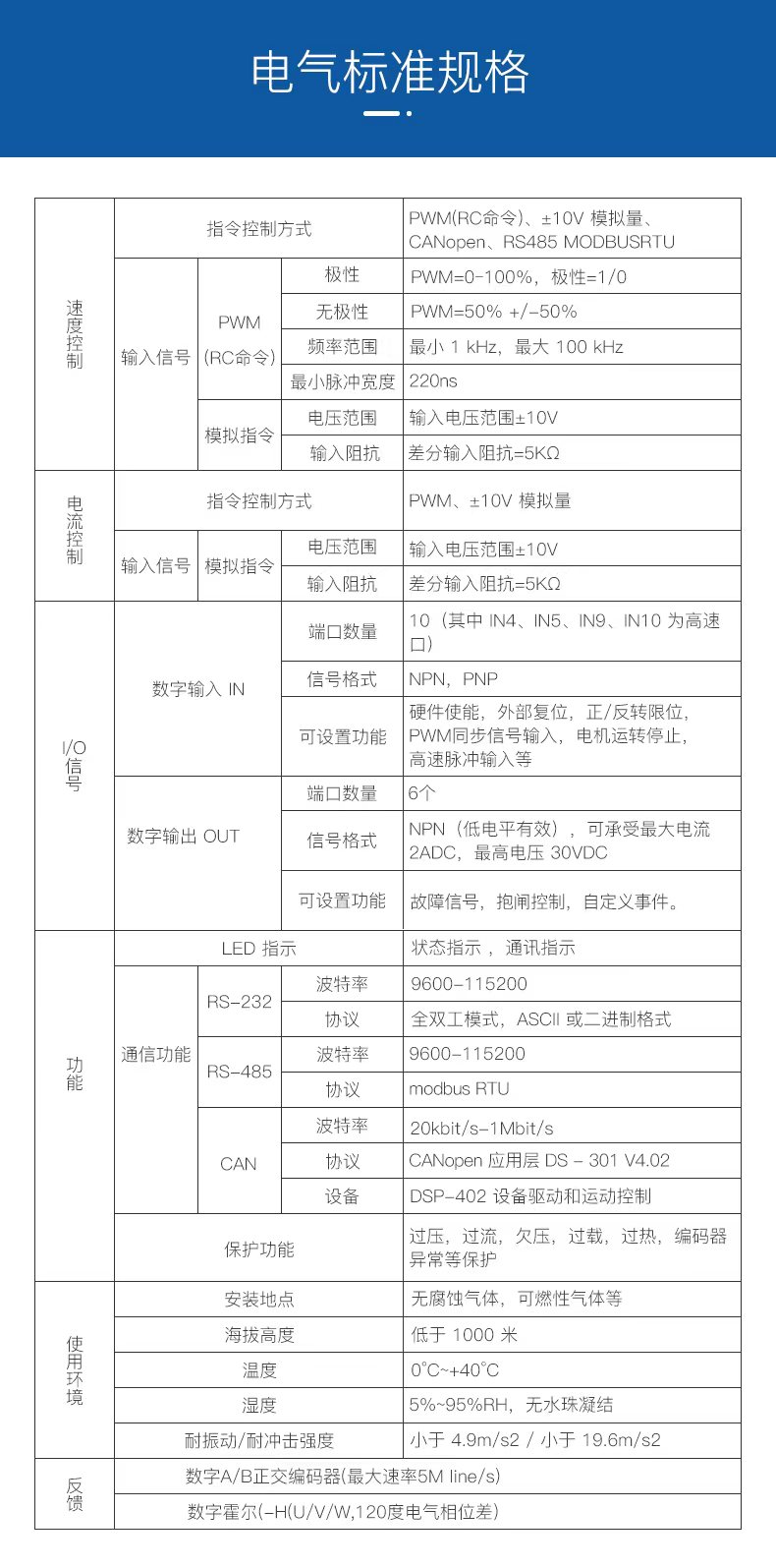 •具有一拖二功能(一个驱动器驱动两个电机)•驱动电机类型:无刷电机、轮毂电机等无刷电机;•CAN2.0 , CANopen DS-402; •供电电压:18-90(135/180)VDC;•电流范围:1Arms-70Arms;
