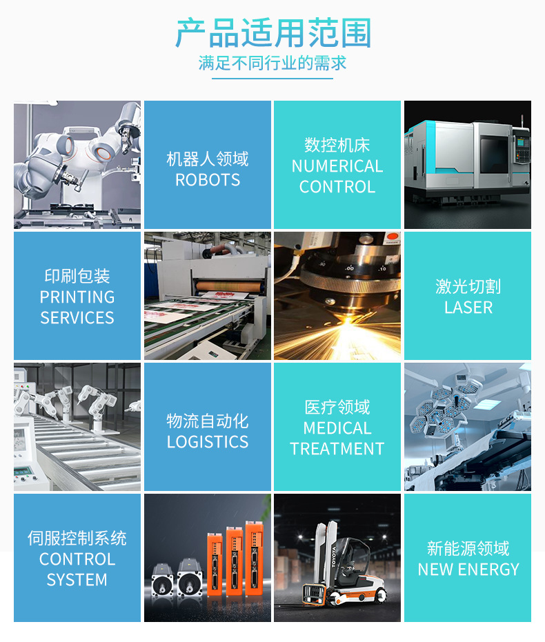 应用设备:医疗器械、物流输送、工业机器人、自动化装配、自动化生产线、新能源叉车、履带机器人、AGV搬运车