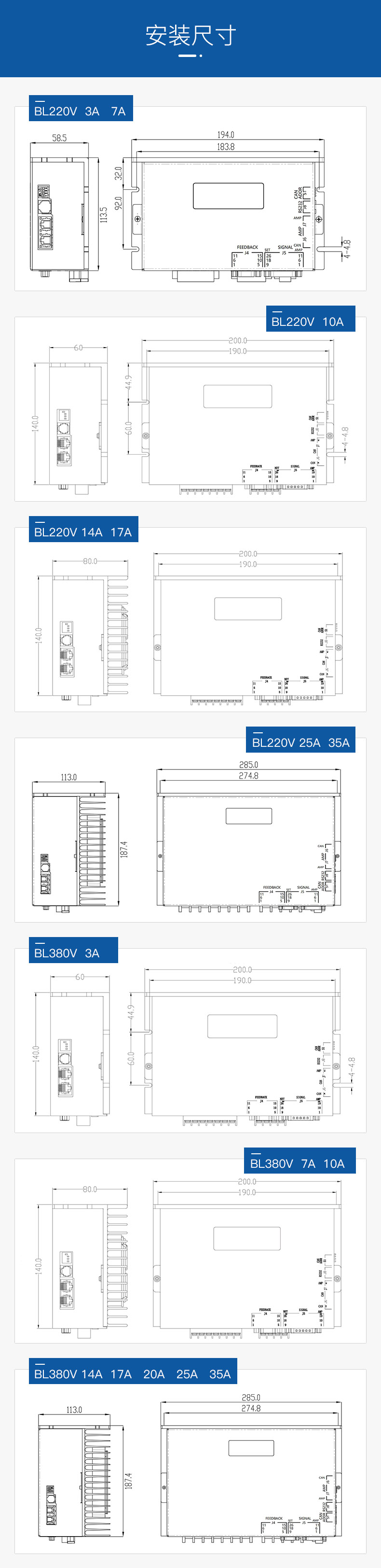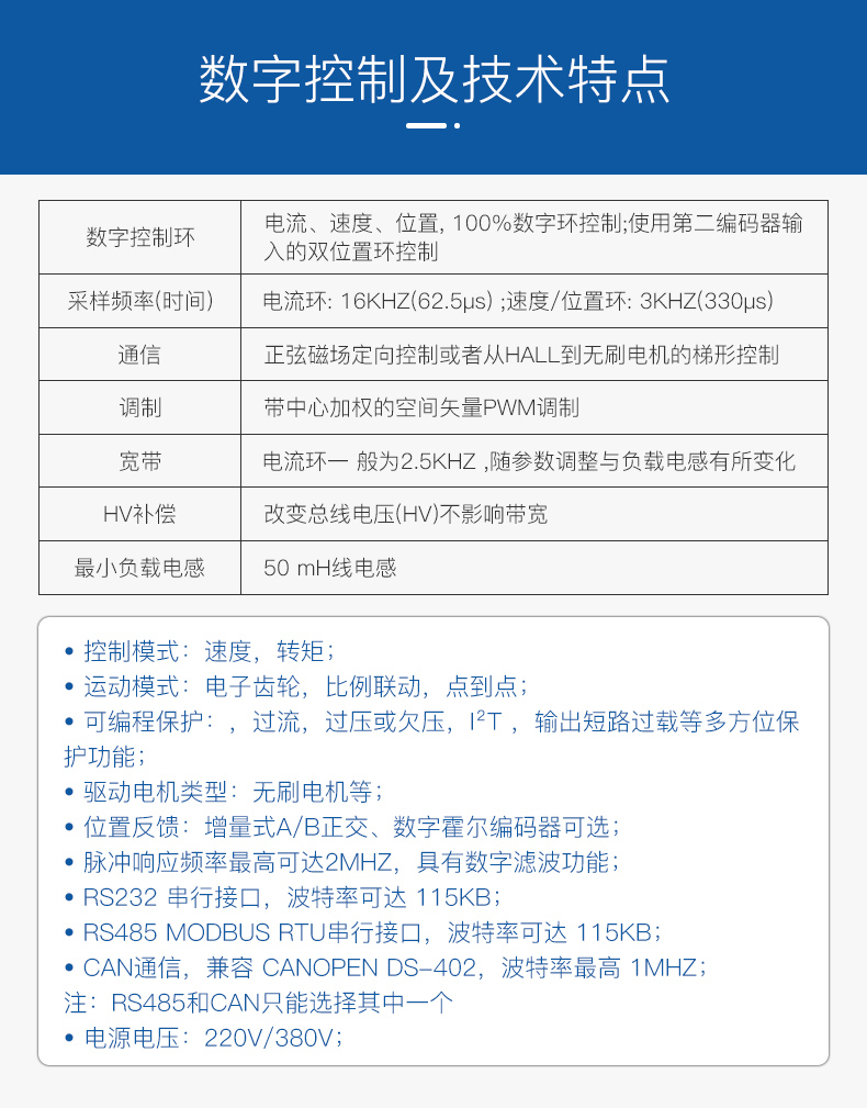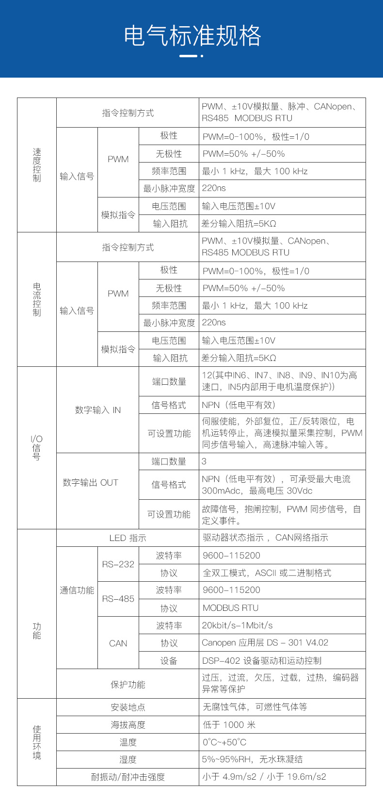 •驱动电机类型:无刷电机等;•CAN2.0 局域总线,兼容 CANopen DS-402;•供电电压:220VAC/380VAC;•电流范围:3Arms-35Arms;