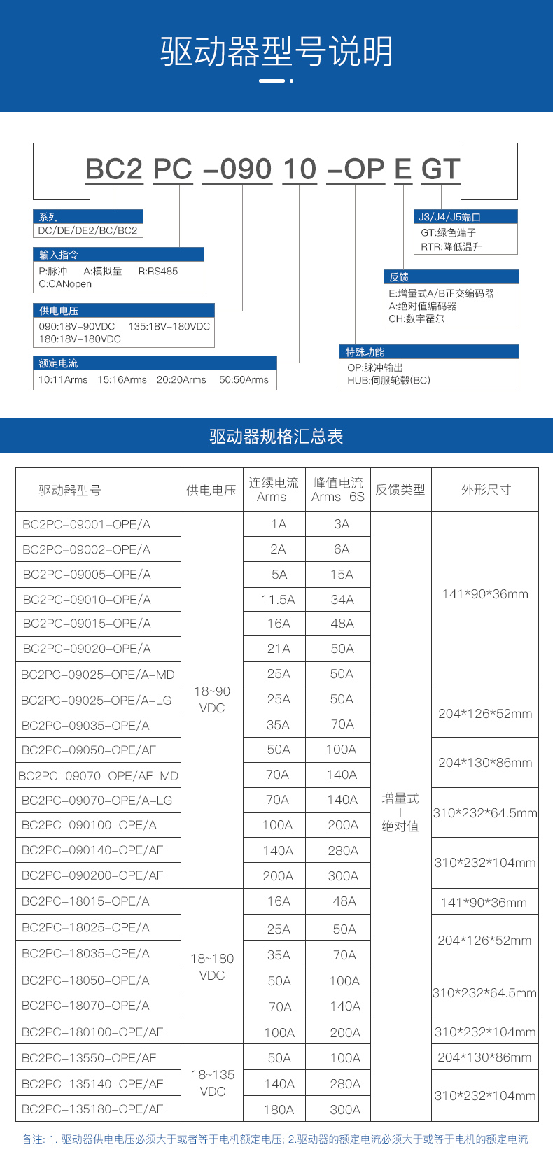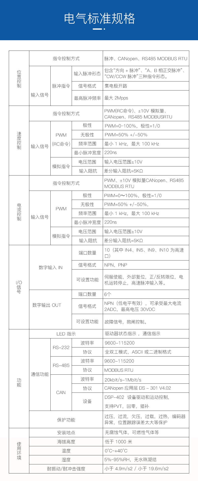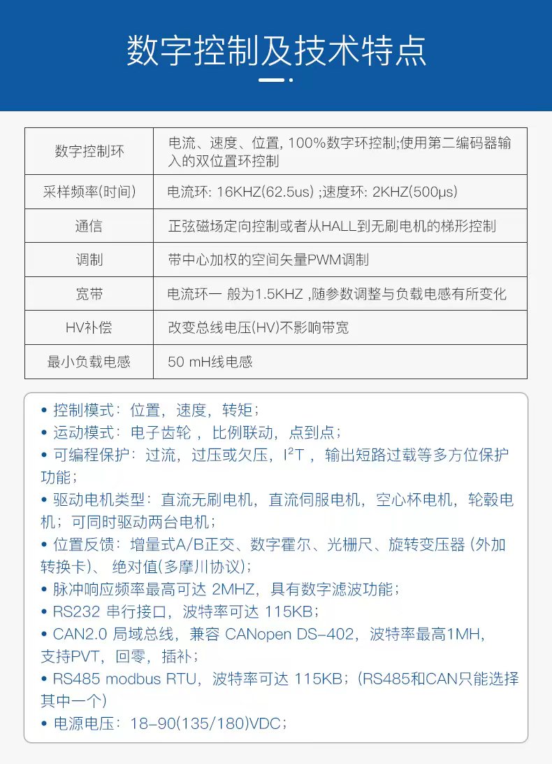 •具有一拖二功能(一个驱动器驱动两个电机)•驱动电机类型:无刷伺服电机、空心杯电机、轮毂电机等伺服电机;•CAN2.0 局域总线,兼容 CANopen DS-402 ;•供电电压:18-90(135/180)VDC;•电流