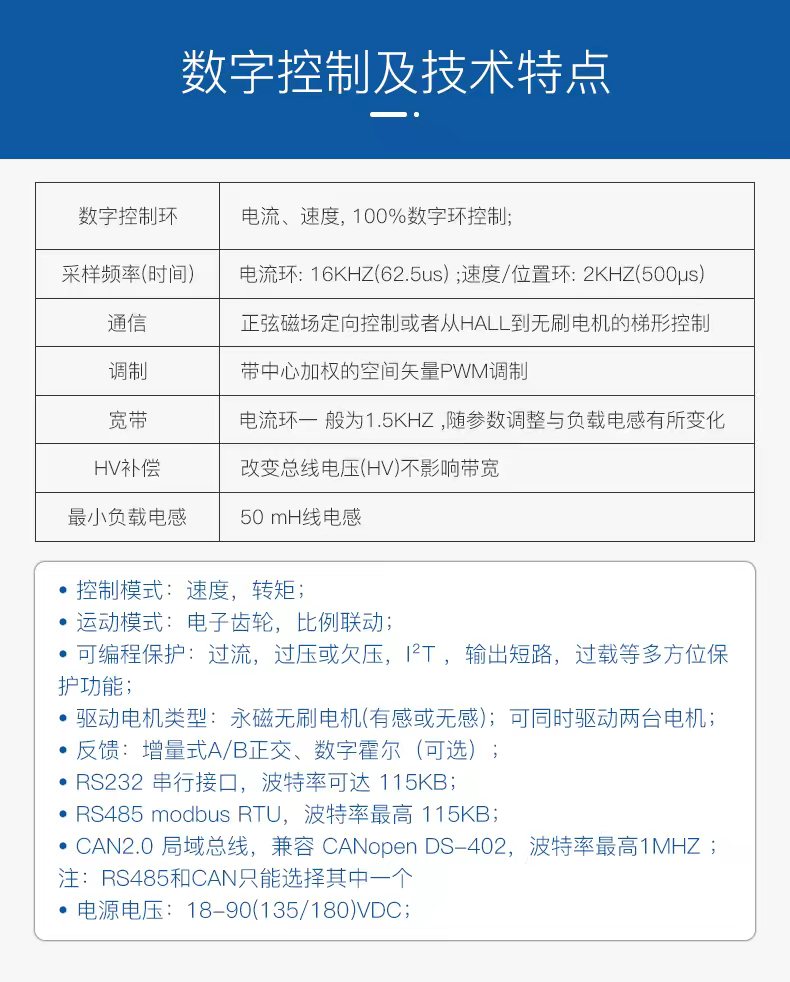 •具有一拖二功能(一个驱动器驱动两个电机)•驱动电机类型:无刷电机、轮毂电机等无刷电机;•CAN2.0 , CANopen DS-402; •供电电压:18-90(135/180)VDC;•电流范围:1Arms-70Arms;
